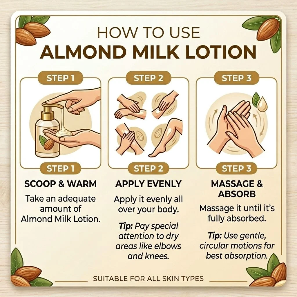 * Take an adequate amount of body lo on. * Apply it evenly all over your body. * Massage it un l it’s absorbed.