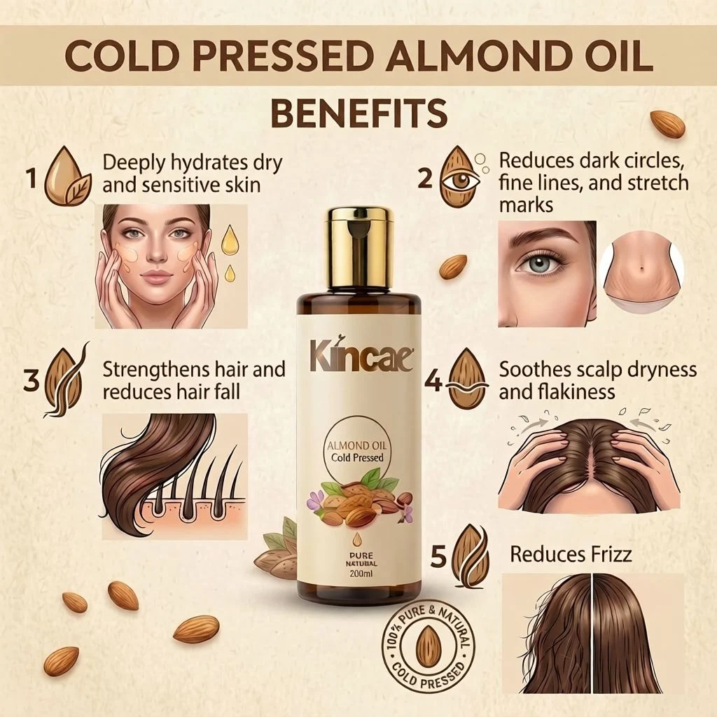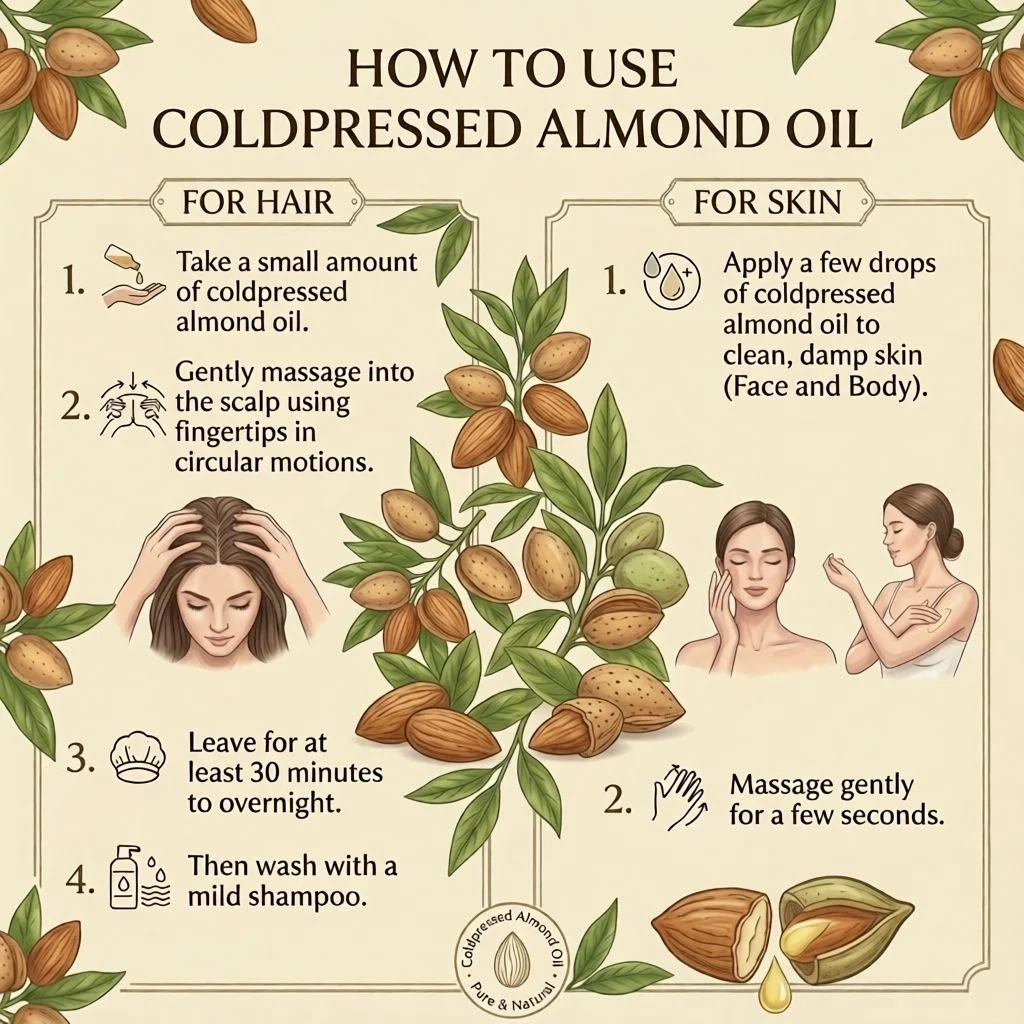 FOR HAIR Take a small amount of sweet almond oil, Gently massage into the scalp using fingertips in circular motions, Leave for at least 30 minutes to overnight, then wash with a mild shampoo. FOR SKIN Apply a few drops of sweet almond oil to clean, damp skin (Face and Body), Massage gently for few seconds.