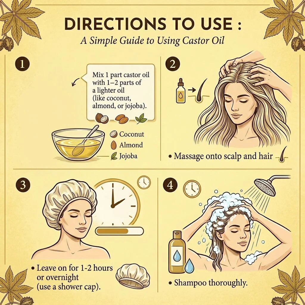 Mix 1 part castor oil with 1-2 parts of a lighter oil (like coconut, almond, or jojoba). • Massage onto scalp and hair • Leave on for 1-2 hours or overnight (use a shower cap). • Shampoo thoroughly.