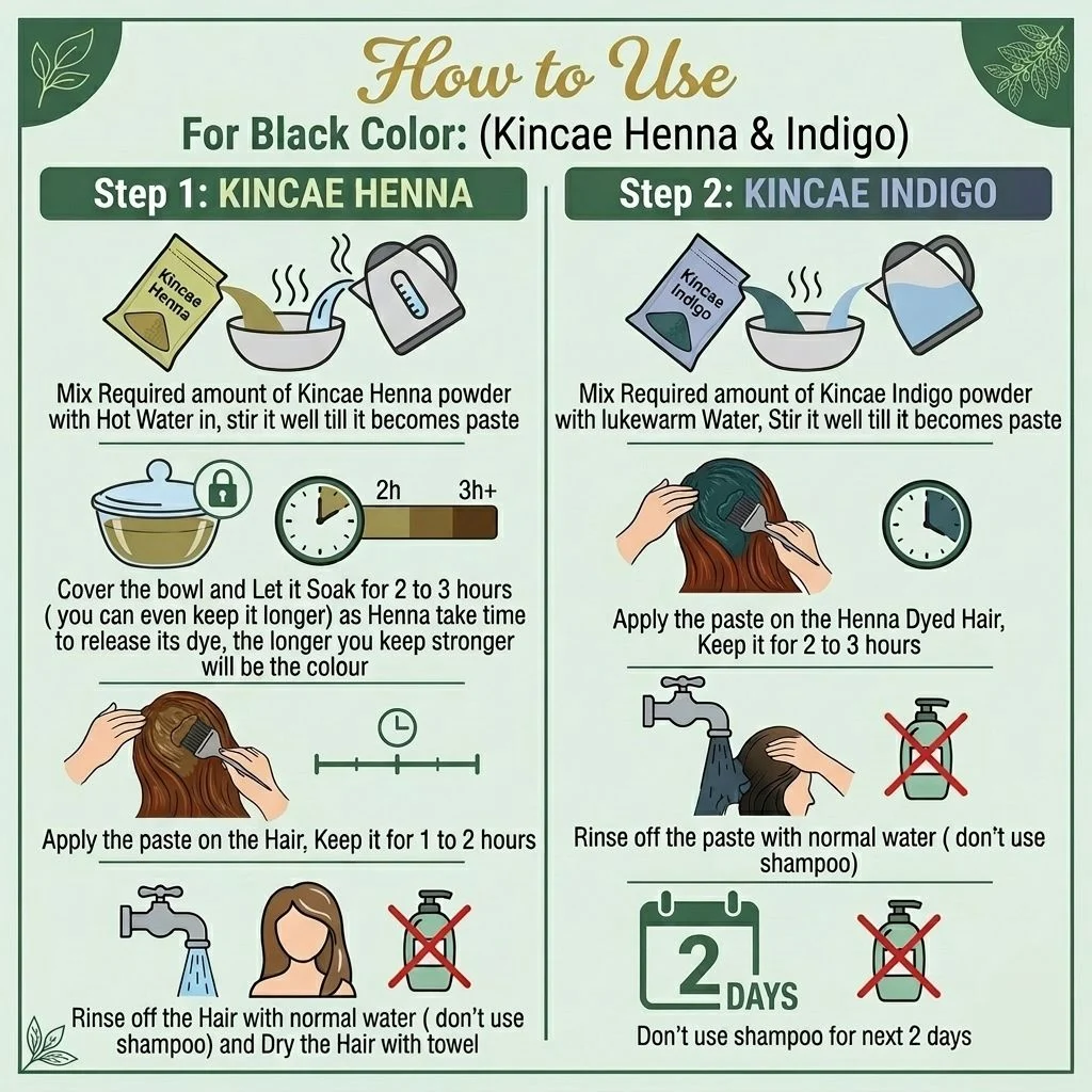 • Mix Required amount of Kincae Indigo powder with lukewarm Water, Stir it well till it becomes paste