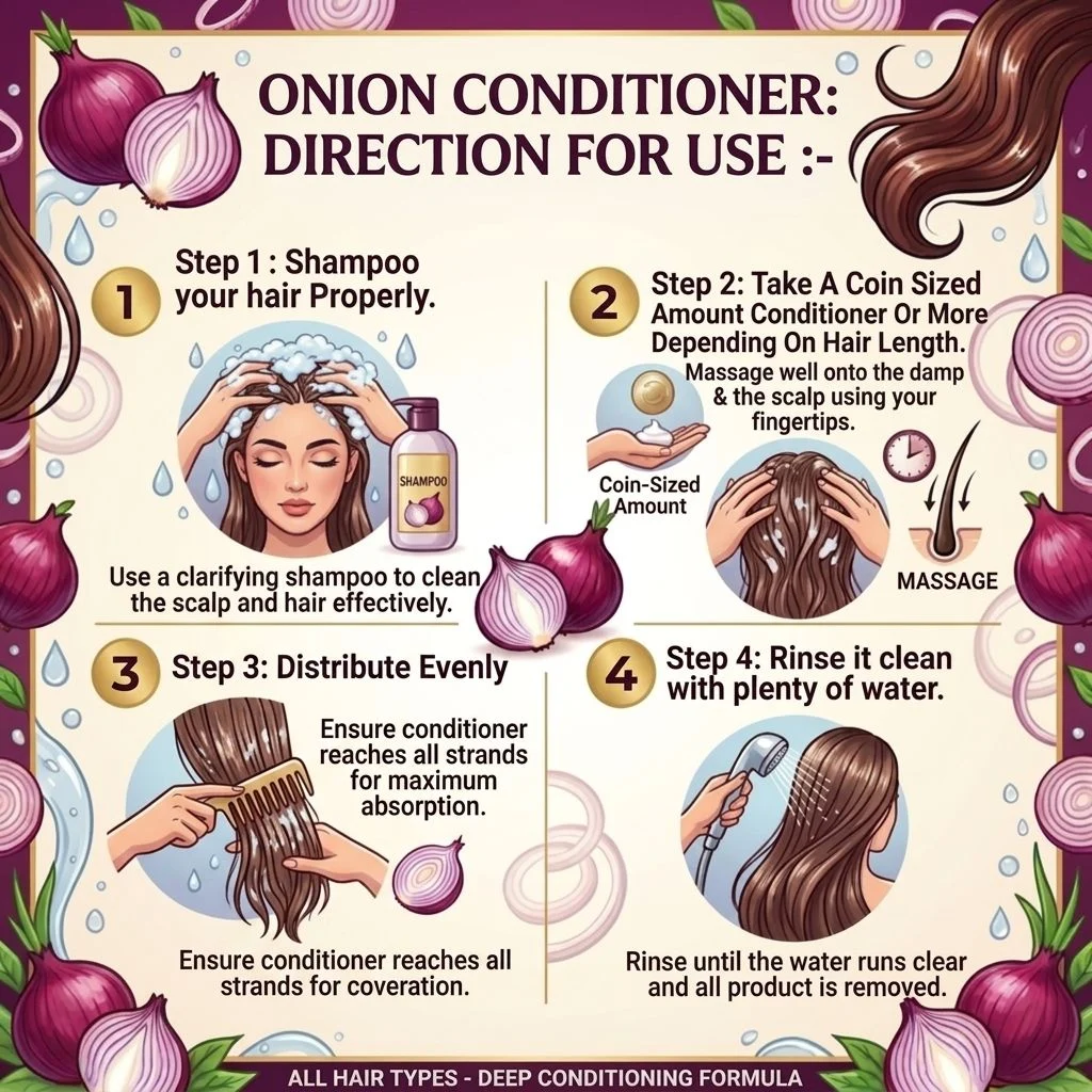 Step 1: Shampoo your hair Properly. Step 2: Take A Coin Sized Amount Conditioner Or More Depending On Hair Length. Massage well onto the damp hair & the scalp using your fingertips. Leave it on for 2-3 minutes. Step 3: Rinse it clean with plenty of water.