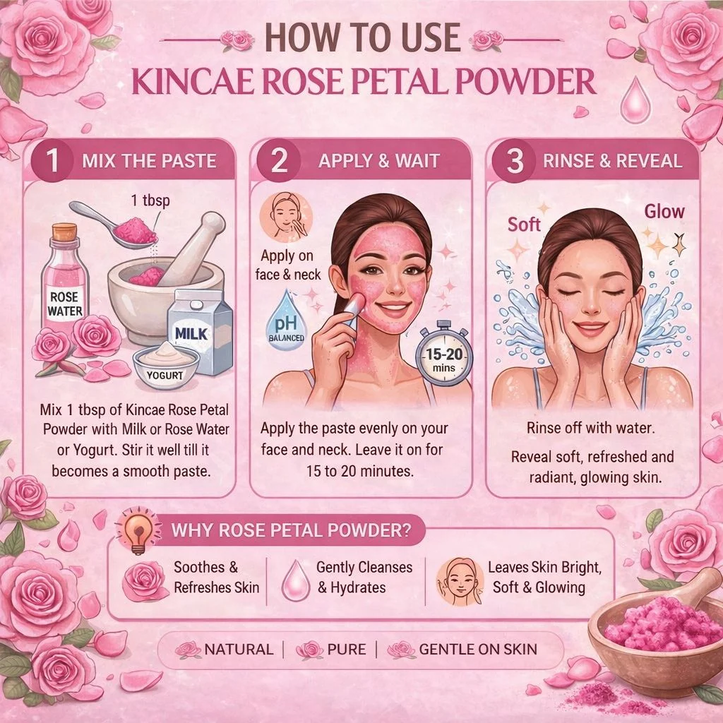 * Mix 1 tbsp of Kincae Rose Petal Powder With Milk or Rose Water or Yogurt , Stir it well till it becomes Paste * Apply the Paste on your Face and Neck, keep the paste for 15 to 20mins * Rinse off with water.