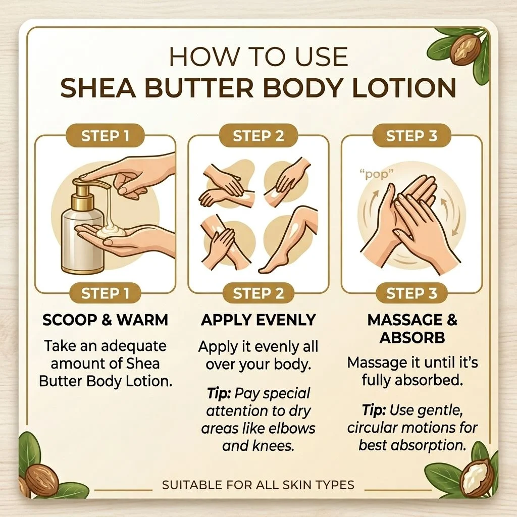 * Take an adequate amount of body lo on. * Apply it evenly all over your body. * Massage it un l it’s absorbed.